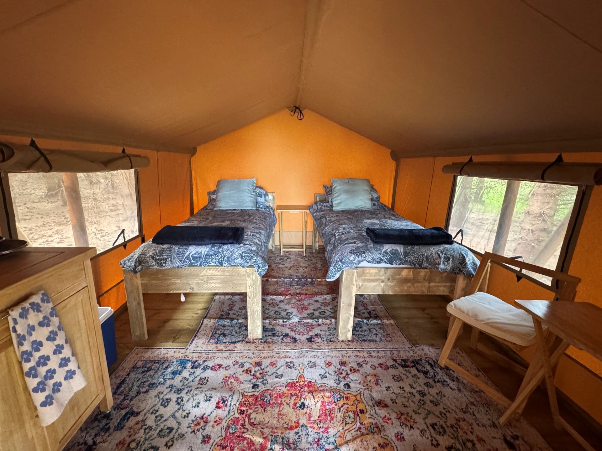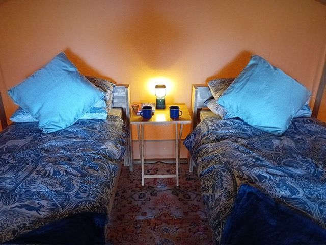 Inside you have two single beds, bedding is provided, and wooden tables and chairs. There is a 2-ring camping stove, crockery, cutlery, pans are provided. Please bring your own towels.