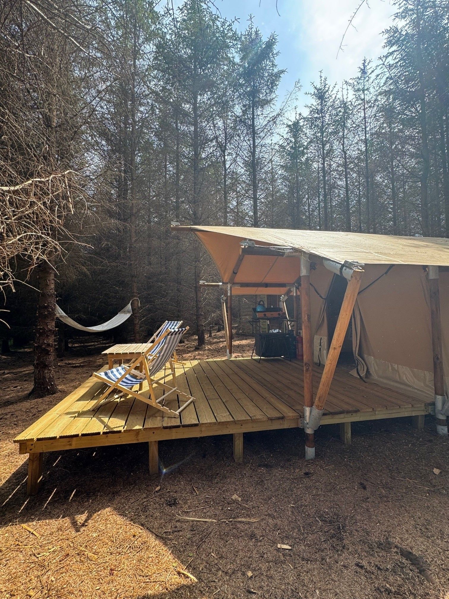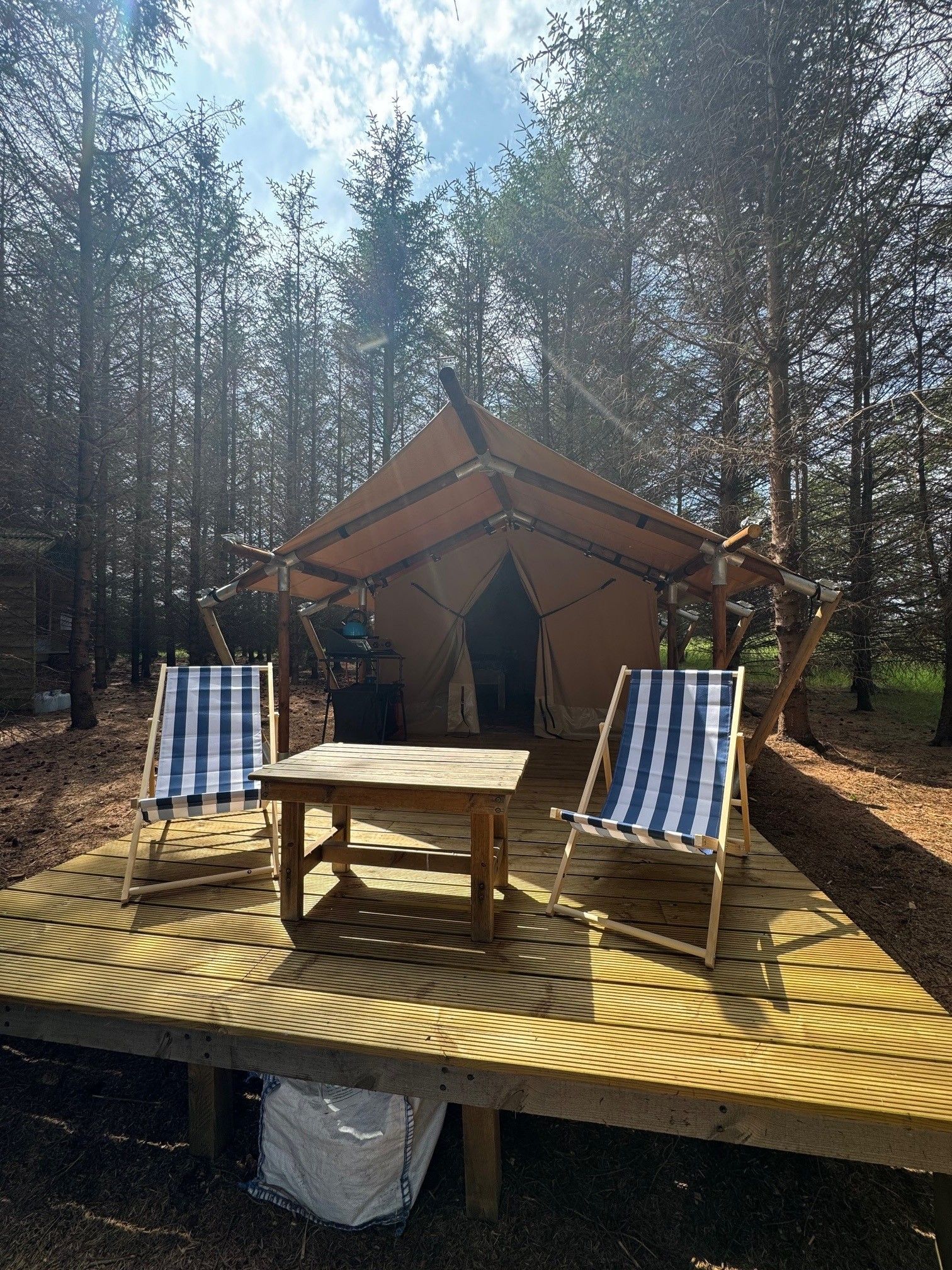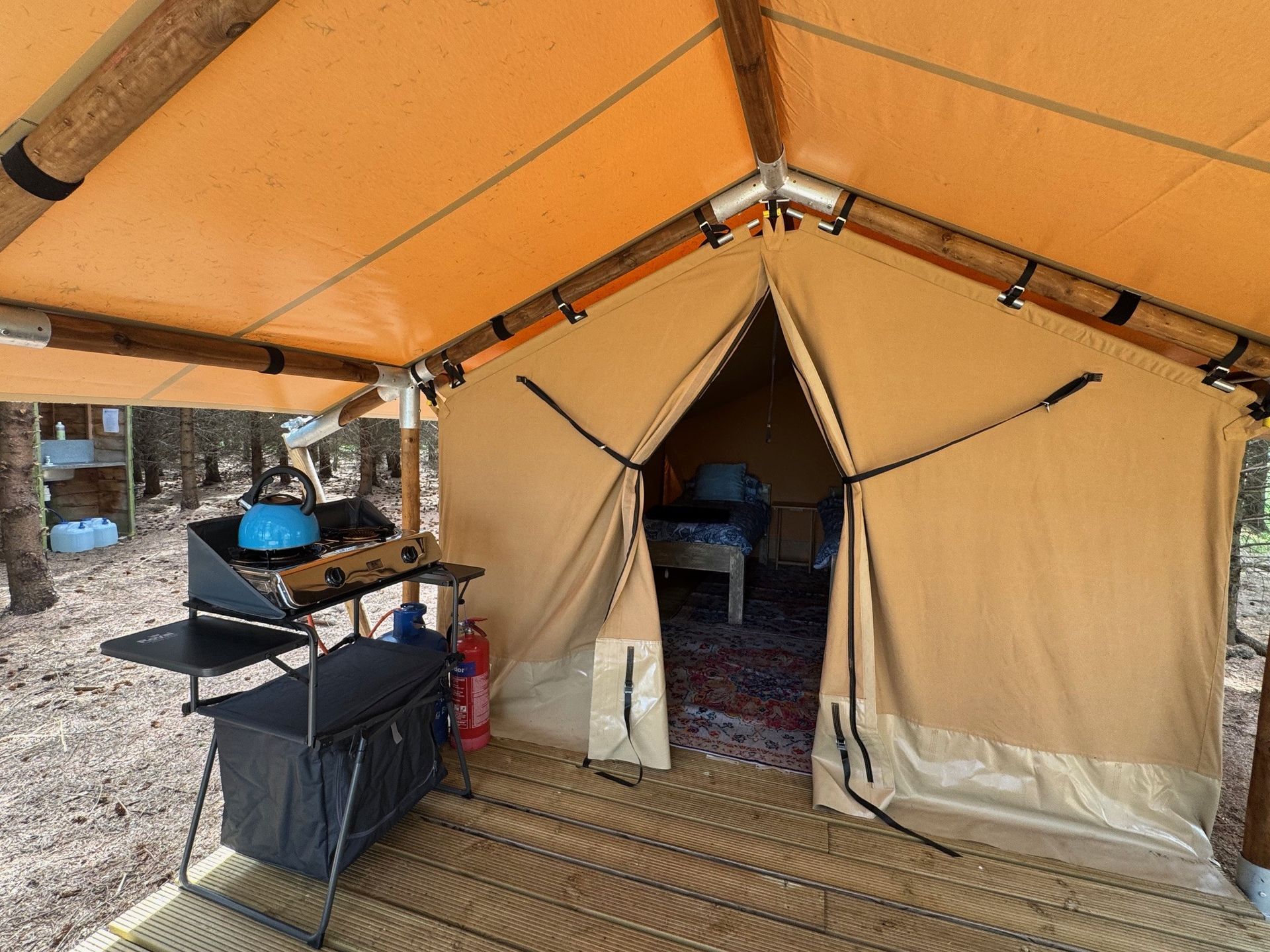 Outside the tent the verandah has a covered section and the front verandah is open so that you can enjoy outdoor living in all weathers, or enjoy a glass of something nice on your deckchair while gazing at the stars above.