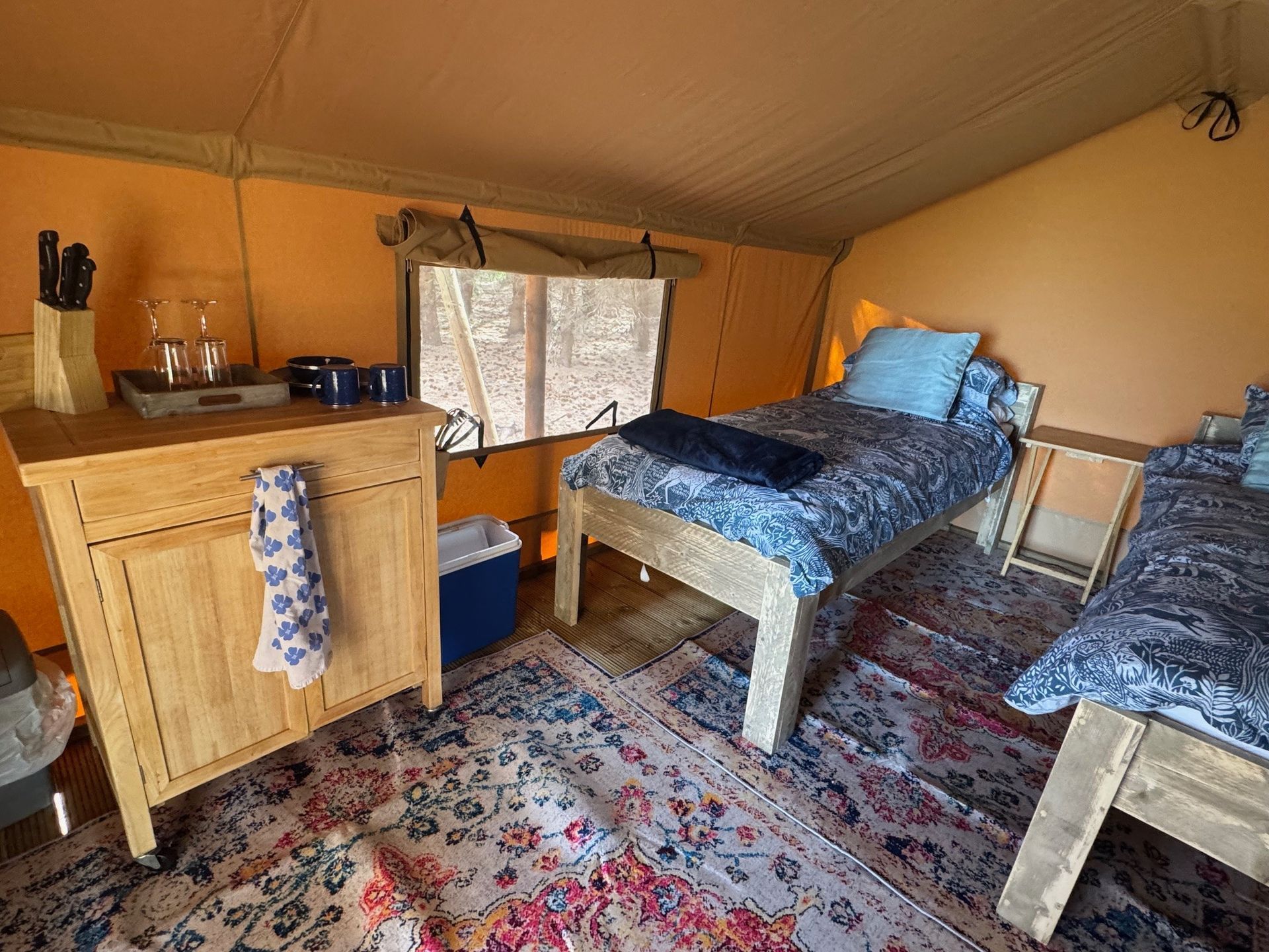 Like at our standard safari tents, there are beautiful views from your tent and privacy from other campers. Each tent has a thunderbox - composting loo & sink hut - and we bring drinking water and logs for your outdoor firebowl each day of your stay. Please note that for safety purposes the firebowls must stay at their set locations, but we think we've chosen those spots well!